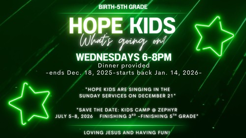 Hope Kidz gather on Sunday morning during the worship service, and again on Wednesday night from 6:00-8:00 pm. Sunday morning and Wednesday night are for children from birth through 5th grade. Dinner is provided on Wednesday nights!